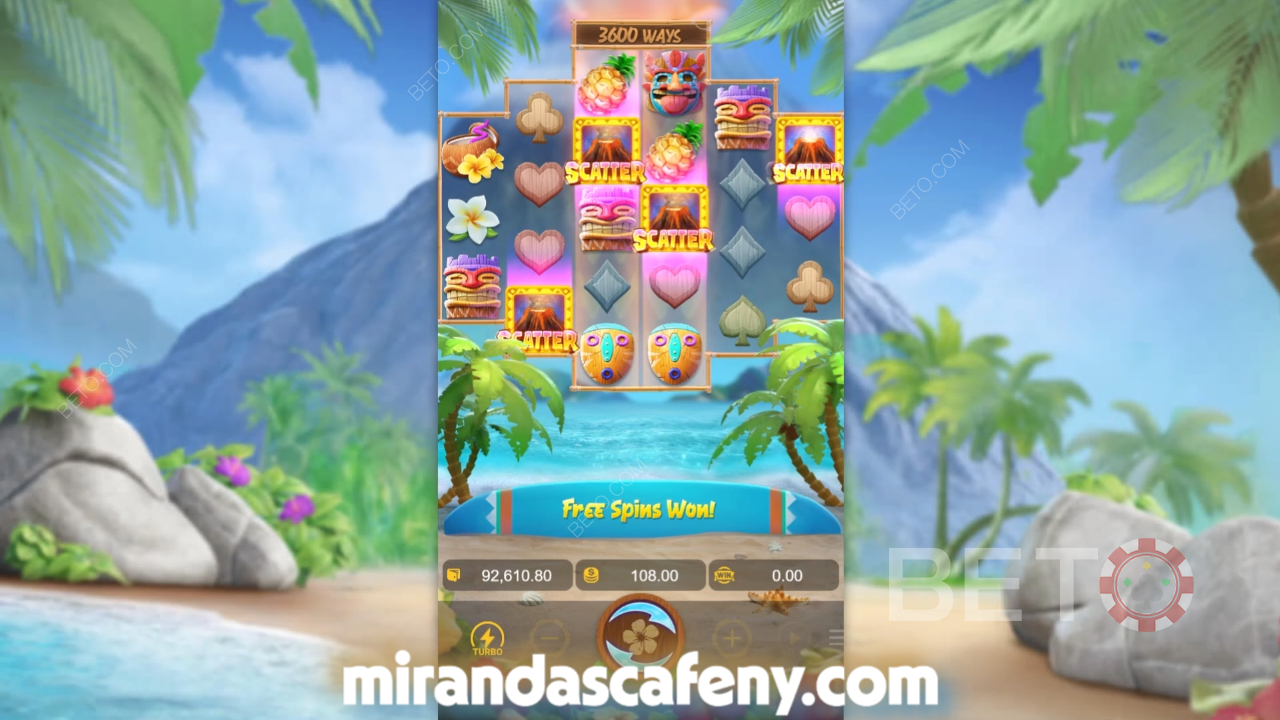 Hawaiian Tiki hadir dengan latar belakang pantai tropis yang indah, ombak yang lembut, dan pohon-pohon palem yang bergoyang. Simbol-simbol Tiki, bunga hibiscus, minuman koktail, dan topi pantai menghiasi gulungan, menciptakan sensasi liburan di setiap putaran. Visual dan efek animasi yang halus membuat pemain merasa seolah sedang berada di pulau tropis, menjadikan setiap sesi bermain menyenangkan dan santai.